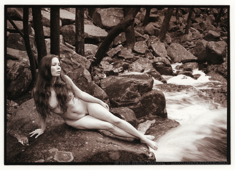 the next day, i decided to test my curve against an image that had some more “bottom” to it, if you will. i pulled out a wonderful, contrasty image of Rhus shot last year in the forests of British Columbia. its got lots of rich dark tones and her skin is just all shimmery highlights. when i took this photograph, Rhus realized after we’d finished that her nails were painted black too. so, this was another test of how rich i could get the dark tones, an important quality for me. because if you don’t have deep shadow tones, the image just looks washed out. initial test prints of this image looked great and i dove in, making larger 10 x 7 inch prints with a mask. the final prints were processed almost the same as above, with the exception of toning time. this one and the next one i only left in the toning bath about 5-6 minutes, just to see how the tones would vary. for the most part, the toned prints have a tad more contrast than the untoned test prints and a color that’s a bit more eggplant than brown. really, rather lovely.